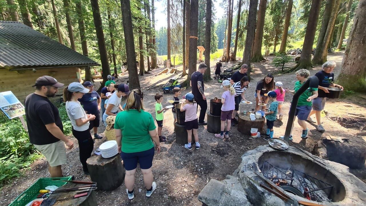 Das gemeinsame Essen am Feuer – Pasta mit Gemüsesugo und ein reichhaltiges Dessertbuffet – rundete den Tag ab und sorgte für gemütliches Beisammensein. Eltern, Grosseltern und Kinder genossen die entspannte Atmosphäre, die von zahlreichen freiwilligen Helferinnen und Helfern getragen wurde.